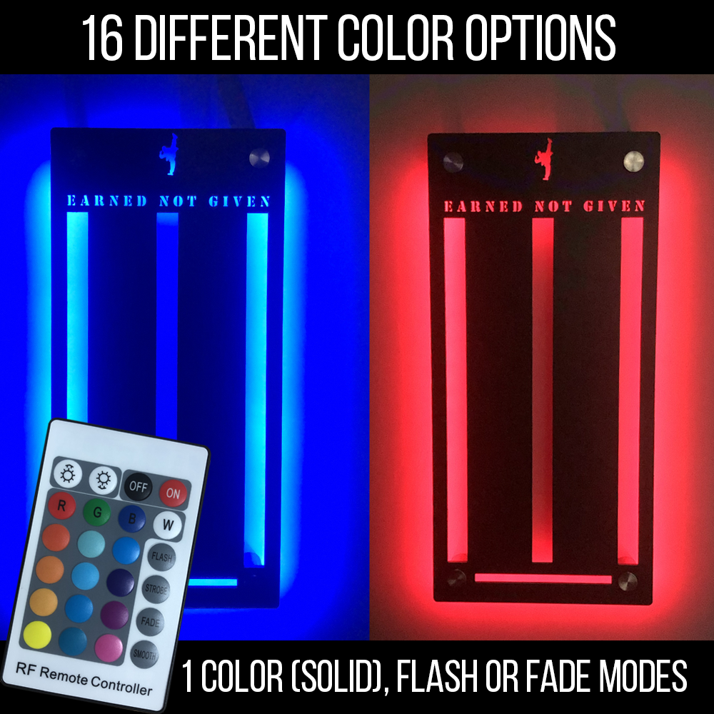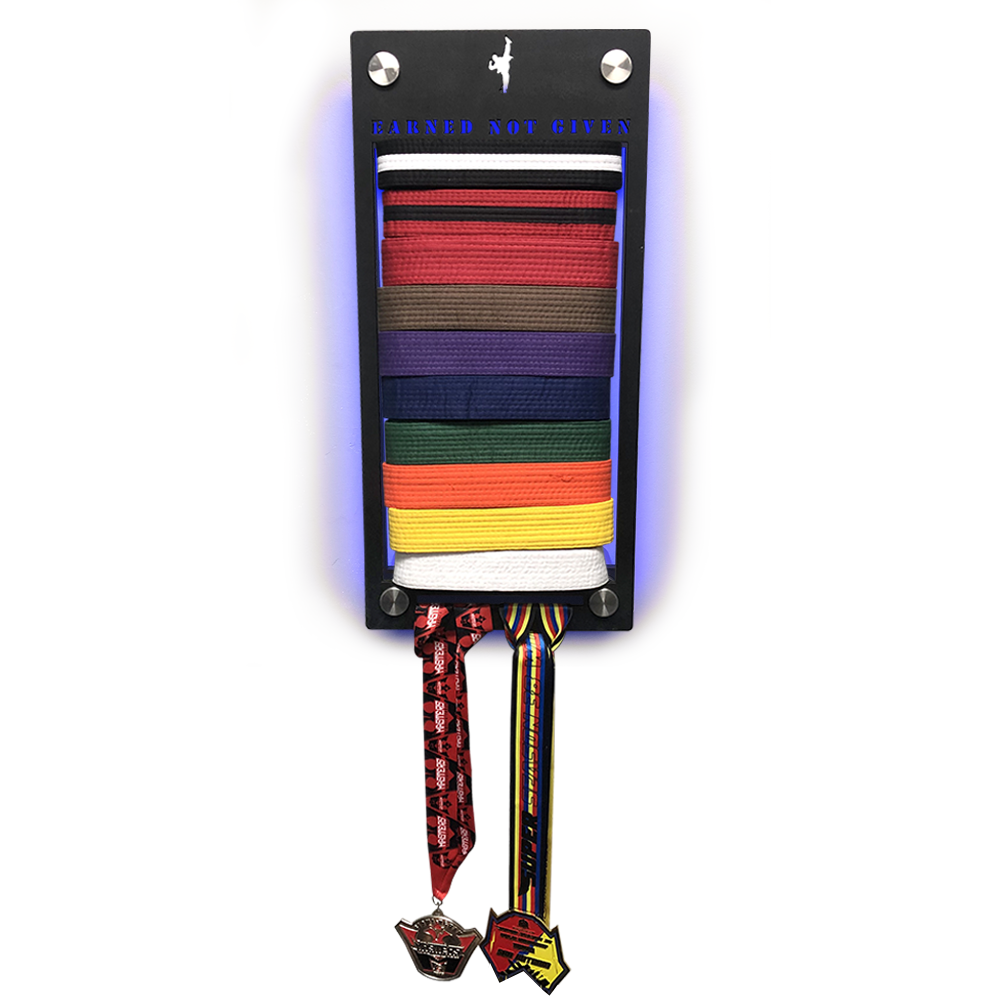 Proudly show off your martial arts accomplishments by displaying your belts and tournament medals on this LED light-up display! Perfect for kids and adults alike, it will add a cool factor to any room!
